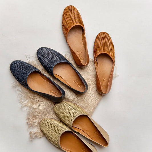 The Yanagi series is available in two styles – our signature peep toe flats with a heel strap,